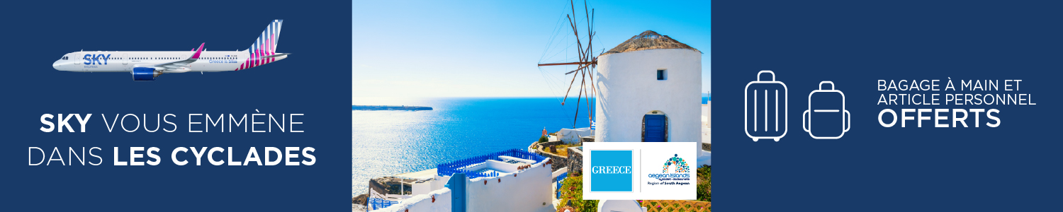 Explorez la magie de Santorin, Mykonos et bien d'autres avec les vols de SKY express, disponibles de décembre à août. Vivez le rêve dans le paradis de l'Égée !